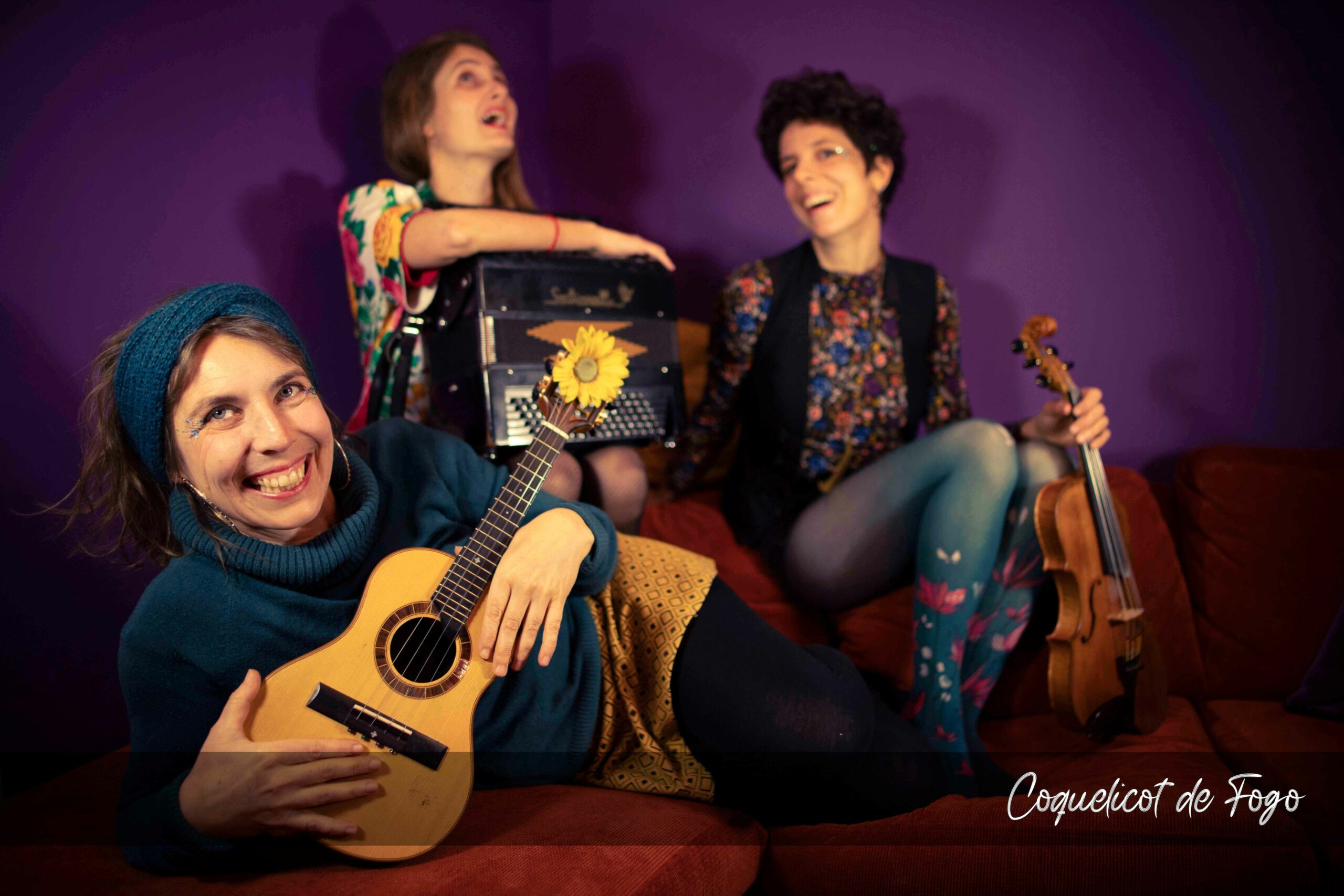 Coquelicot de Fogo, phœnix féminin à trois têtes, doit son nom à la plante qui surgit dans les flammes. Les pieds nus ancrés dans cette terre incandescente, les Coquelicot donnent à goûter leur musique pimentée et fleurie aux parfums cosmopolites. Avec leurs percussions, elles convient les épidermes à un peau à peau pétillant.