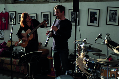 Muriel Erdödy aux cordes vibrantes. Auteure et compositrice. Alexis Kowalczewski à la clarinette, batterie sauvage, arrangeur et faiseur de sons et d’espaces.