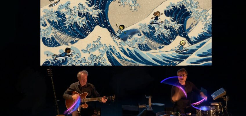 Les musiciens, de part et d’autre de l’écran central manipulent quelques objets colorés, mais surtout avec leur instrumentarium incroyable – mêlant instruments à cordes et eau, cailloux, tiges de verres ou feuilles de papier – nous emmènent dans un monde sonore inouïe et virtuose.